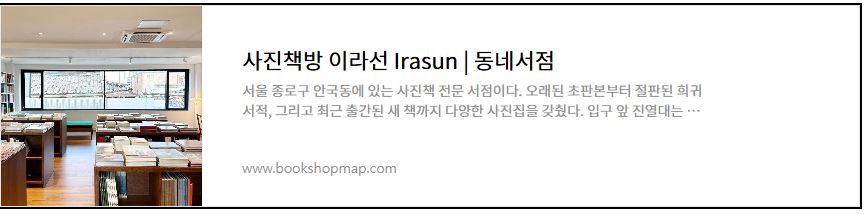 인디문학 1호점은 책을 분류해둔 기준이 특이합니다. 분류 기준 중에 낭만도 있었고, 색깔 별로 진열을 해두기도 했습니다. 서점 주인이 작가이기도 해요. 도토리 서점 다람쥐 극장은 개성있고 세련된 인테리어와 1인용 극장을 가진 예술 공간입니다. 서점 주인은 애니메이터 출신의 예술가 입니다. 사진책방 이라선은 사진집을 전문으로 취급하는 곳인데요 듣도 보도 못한 사진가들의 멋진 사진집들이 가득합니다.